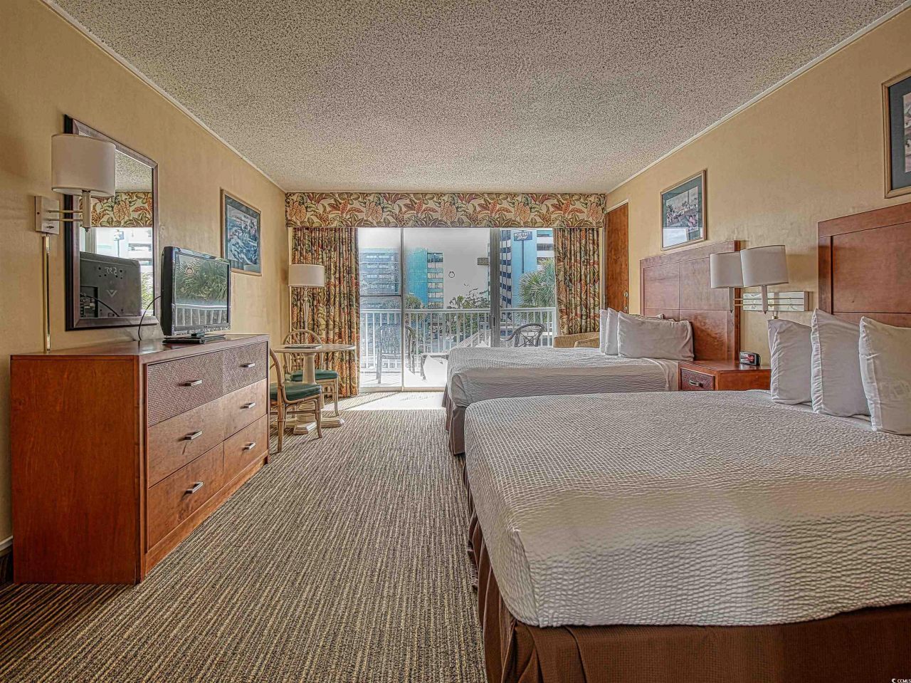 Coastal comfort meets convenience in this beautifully appointed efficiency unit. Enjoy a private balcony with views of the courtyard pool and hot tub, just steps from the ocean for easy beach days. Inside, two queen beds provide a restful nights sleep, while a functional kitchenettefeaturing a sink, coffee maker, cooktop, microwave, and refrigeratortakes care of quick meals and snacks. Located in a prime spot near shopping, golf, dining, and nightlife, this inviting suite offers the perfect blend of relaxation and accessibility for an unforgettable coastal getaway.